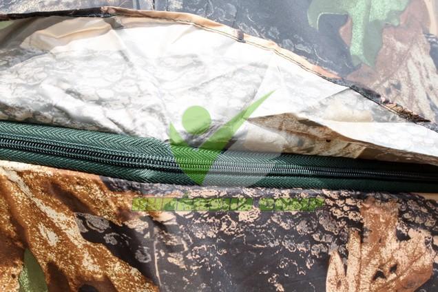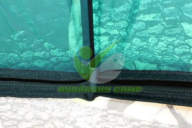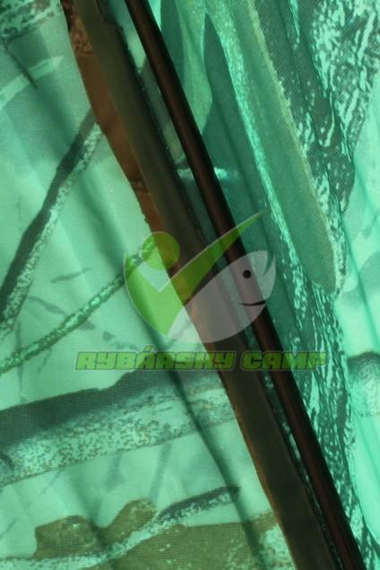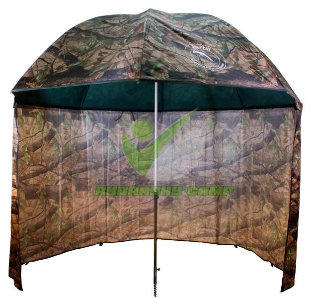Dáždnik s bočnicou je ideálnym prístreškom pri krátkodobých vychádzkach k vode. Určený pre ochranu pred slnkom , rosou a dažďom. Na výrobu kupoly a bočnej steny bol použitý materiál Nylon s PVC krycou vrstvou, čím získava dáždnik podstatne vyšší stupeň nepremokavosti. Švy dáždnika sú prelepné vodeodolnou páskou pre zabezpečenie nepremokavosti. K dispozícii je bočná, predĺžená stena ktorá sa upevňuje pomocou zipsu okolo kupoly. Spodná časť bočnej steny je osadená úchytmi pre pripevnenie k zemi pomocou zaisťovacích kolíkov (kolíky sú súčasťou dodávky). Zipsy sú plne prekryté kusom látky pre zabezpečenie ich nepremokavosti. Dáždnik disponuje možnosťou nastavenia výšky a sklonu kupoly.Farebné prevedenie je kamuflážové.