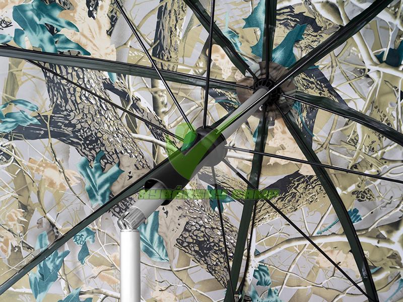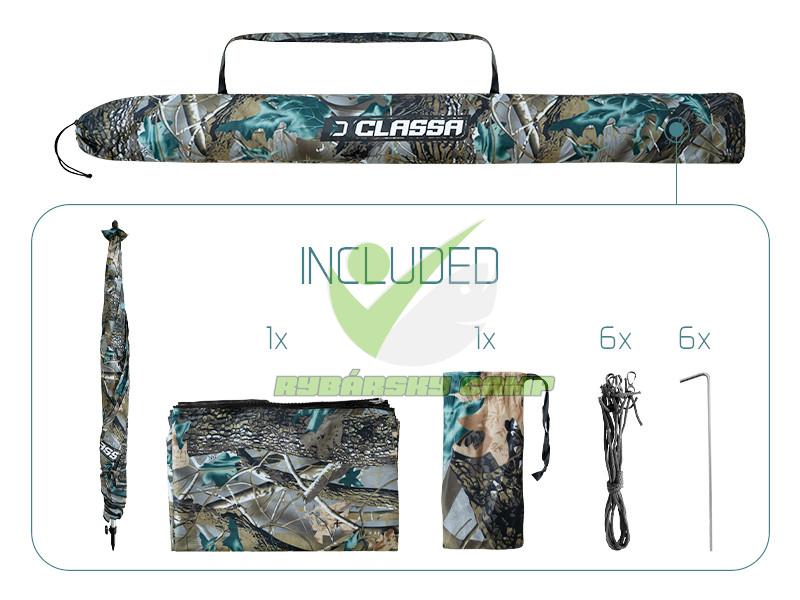 Švy dáždnika sú za horúca kompletne podlepené vodeodolnou páskou pre zabezpečenie 100% nepremokavosti aj pri väčšom daždi. Pre lepšiu stabilitu vo vetre je dáždnik CLASSA CAMO vybavený štyrmi ukotvovacími lanami. K dispozícii je bočná, predĺžená stena ktorá sa upevňuje pomocou kvalitného zipsu okolo kopuly. Spodná časť bočnice je osadená úchytmi pre upevnenie k zemi pomocou zaisťovacích kolíkov (kolíky sú súčasťou balenia).